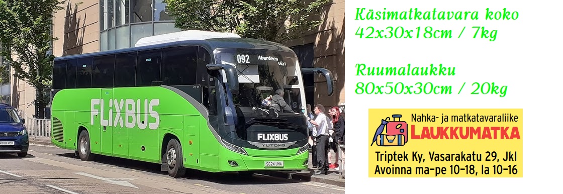 Kun valitset oikean kokoisen laukun jo etukäteen, matkasi sujuu huomattavasti helpommin. Tilaa Flixbussin käsimatkatavaroihin sopiva laukku tai ruumaan kirjattava matkalaukku suoraan Laukkumatkan verkkokaupasta tai käy myymälässämme ja lähde matkalle huoletta. www.laukkumatka.fi