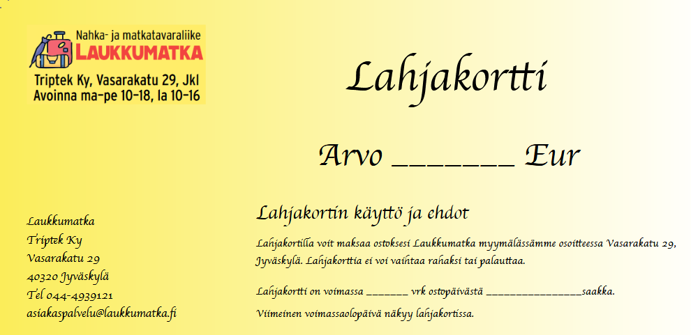 Helppo hankkia ja aina onnistunut: Laukkumatka -lahjakortti on lahja, joka tekee matkustamisesta mukavampaa, kevyempää ja tyylikkäämpää.