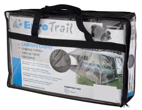 Eurotrail-telttamatto: käytännöllinen, kestävä ja helppo muokata. Telttamatto suojaa pohjakerrosta liialliselta kulumiselta ja on mukavan pehmeä. Matossa on nailonydin, jota ympäröi erityinen vaahtokerros, joka voidaan leikata haluttuun kokoon. Eurotrail-maton pidikkeillä (valinnainen) voit kiinnittää maton kulmiin tapilla. Käytön jälkeen voit varastoida maton erityiseen Eurotrail-telttamattopussiin (valinnainen). Saatavana eri kokoja ja värejä. Kangas: 100% PVC ± 500 gr / m2% polyamidia – Hengittävä rakenne – Lämmöneristys – Veden ja lian tyhjentäminen – Värisävyinen – Helppo puhdistaa – Säänkestävä Saatavana erikokoisina: