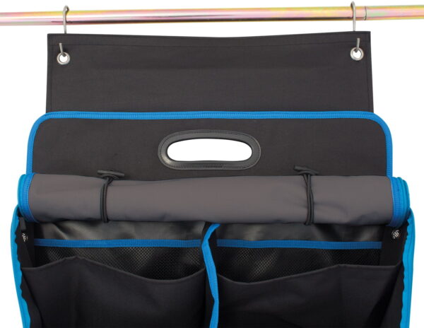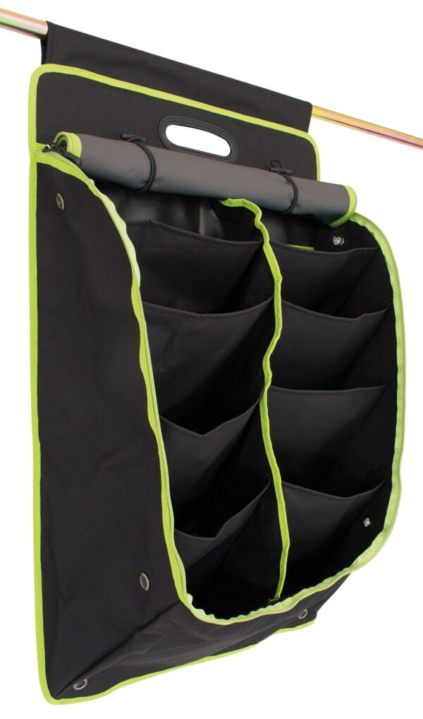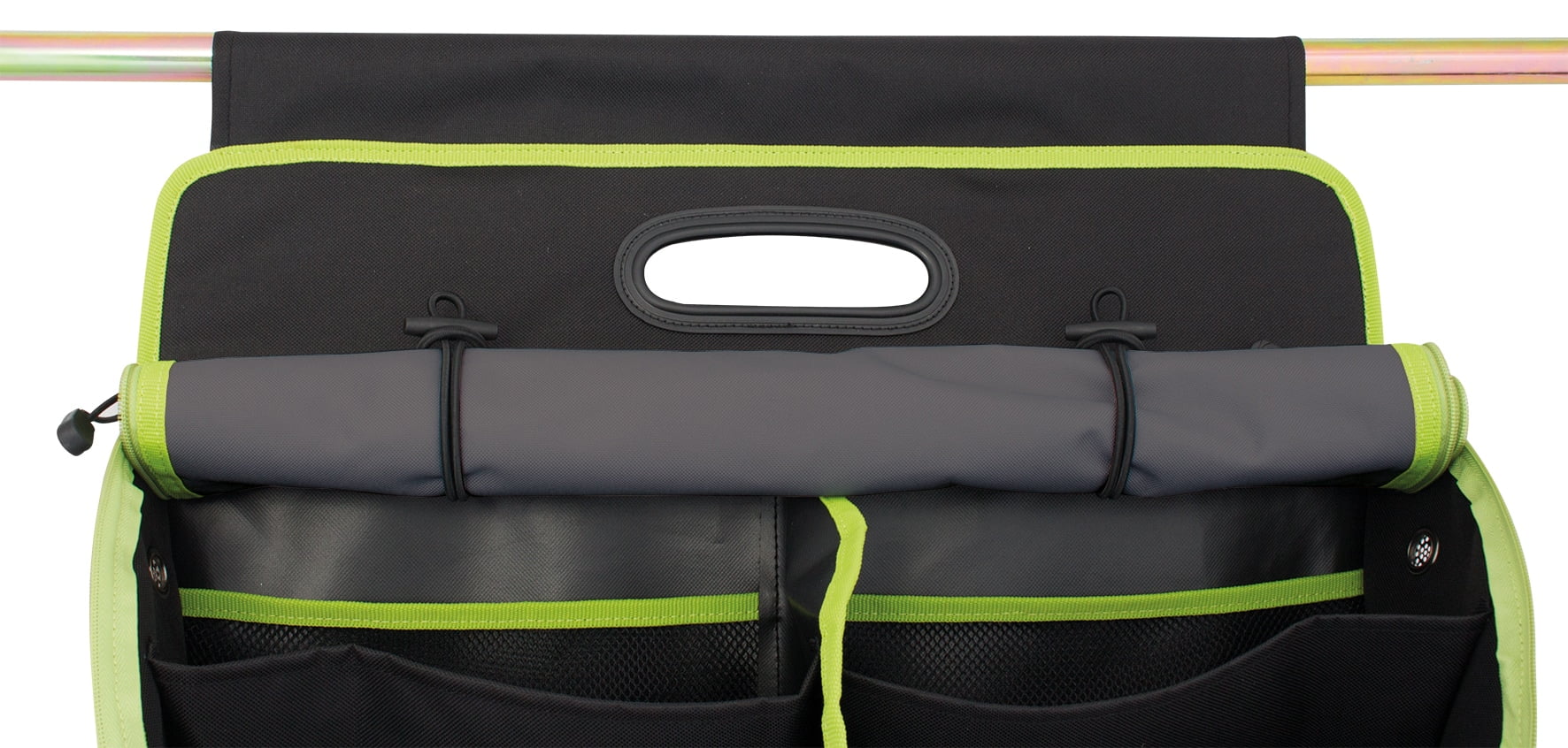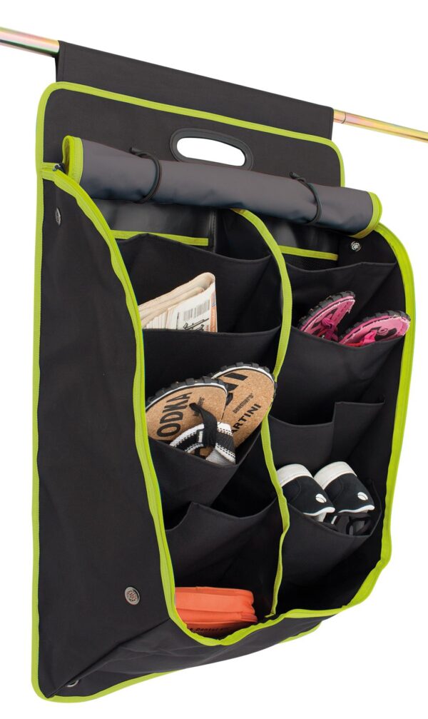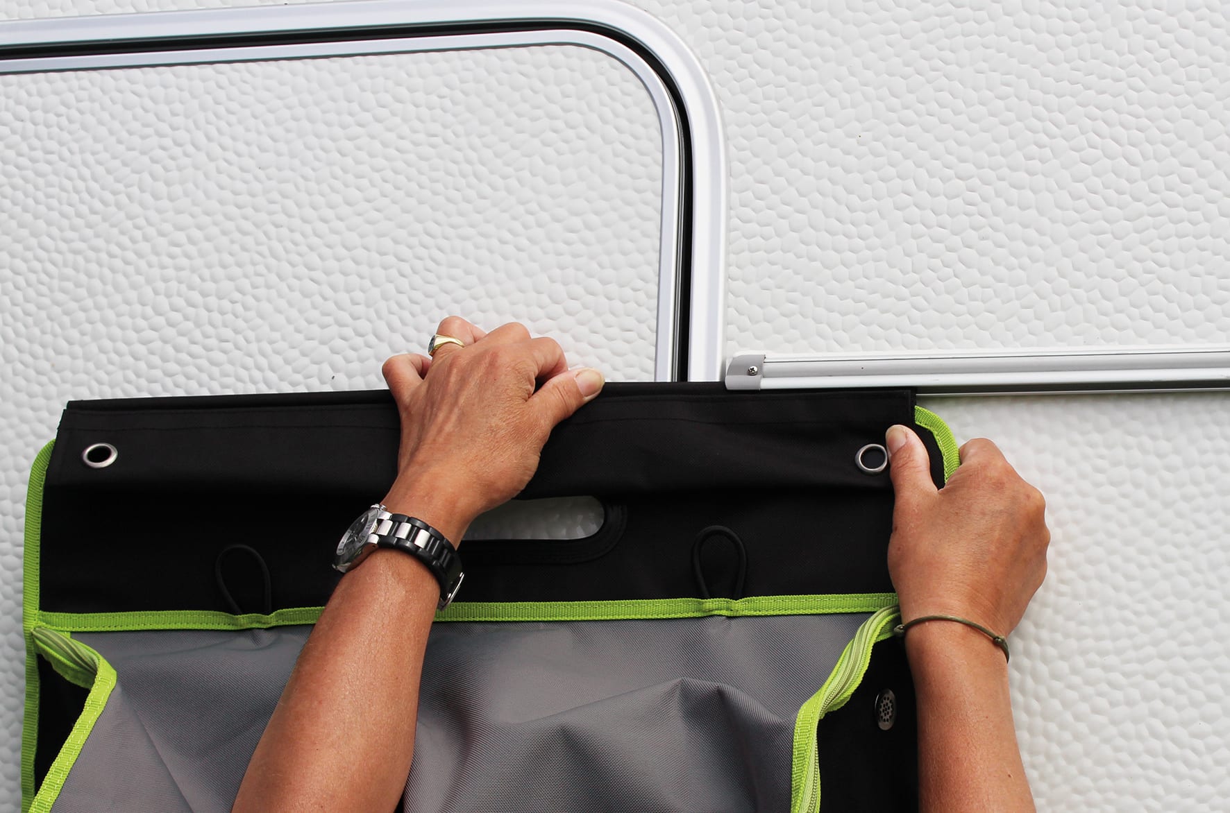 Erittäin tilava järjestäjä kaikenlaisiin retkeilyesineisiin, kuten kenkiin, pyyhkeisiin tai muihin vaatteisiin. Oxfordissa on vetoketjusuoja, joka on helppo kuljettaa ja varustettu tuuletusrenkailla. Oxfordin yläosassa on tukeva muovikahva ja se voidaan kiinnittää eri tavoin; putkilla asuntovaunun kiskolla, tarrakiinnityksellä telttapylväässä tai silmukoilla. Oxfordia on saatavana 2 kokoa: Oxford S: 28x80cm, 5 isoa taskua ja 1 mesh-tasku Oxford L: 53x80cm, 8 tilavaa sisätaskua ja 2 mesh-taskua Materiaali: 100% Oxford Polyesteri Väri: Musta / Lime