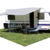 Universaali markiisi asuntovaunuille. Katos on aina 240 cm syvä ja saatavana eri leveyksinä. Mukana tulee putkisto, jolla katos kiinnitetään asuntovaunun markiisiprofiiliin.