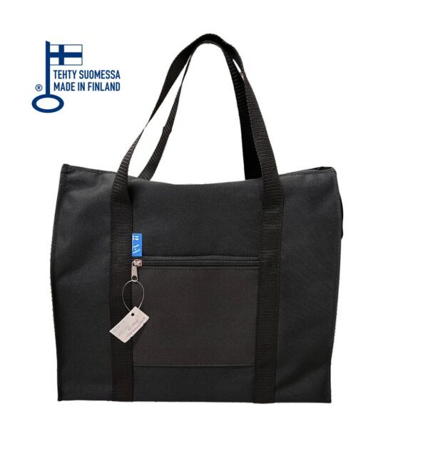 Tilava kotimainen kauppakassi, joka suljetaan vetoketjulla. Ulkopuolella ostoskassissa vetoketjutasku. Vuoreton. Sisäpuoli helposti pyyhittävissä. Kestää painoa, vahvat kantokahvat. Pohjassa tukipahvi.