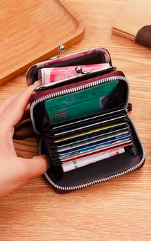 Kätevä ja kompakti kukkaro, jossa mahtava integroitu korttikotelo mukana kyljessä, vetoketjullinen. Turvaranneke.