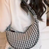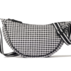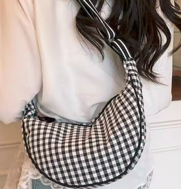 Olkalaukku ruudullinen, ns banaani kaareva muotoilu, myötäilee mukvasti kantajaansa. Muodikas ja tyylikäs joka vuoden laukku. Pehmeää canvasta.