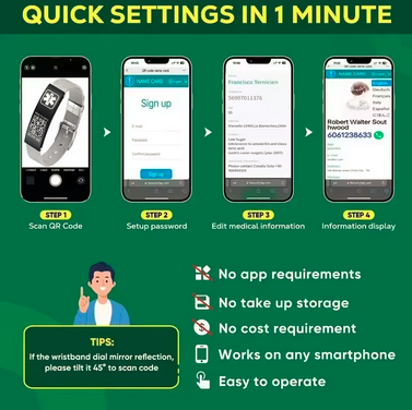 Asenna helposti henkilökohtainen lääketieteellinen rannekkeesi. Skannaa vain QR-koodi, aseta salasana ja aloita henkilökohtaisten tietojesi muokkaaminen. Syötä puhelinnumerosi ja sähköpostiosoitteesi, napsauta ”Aktivoi” avataksesi perheesi terveystiedot. Ei sovellusta tarvita!
